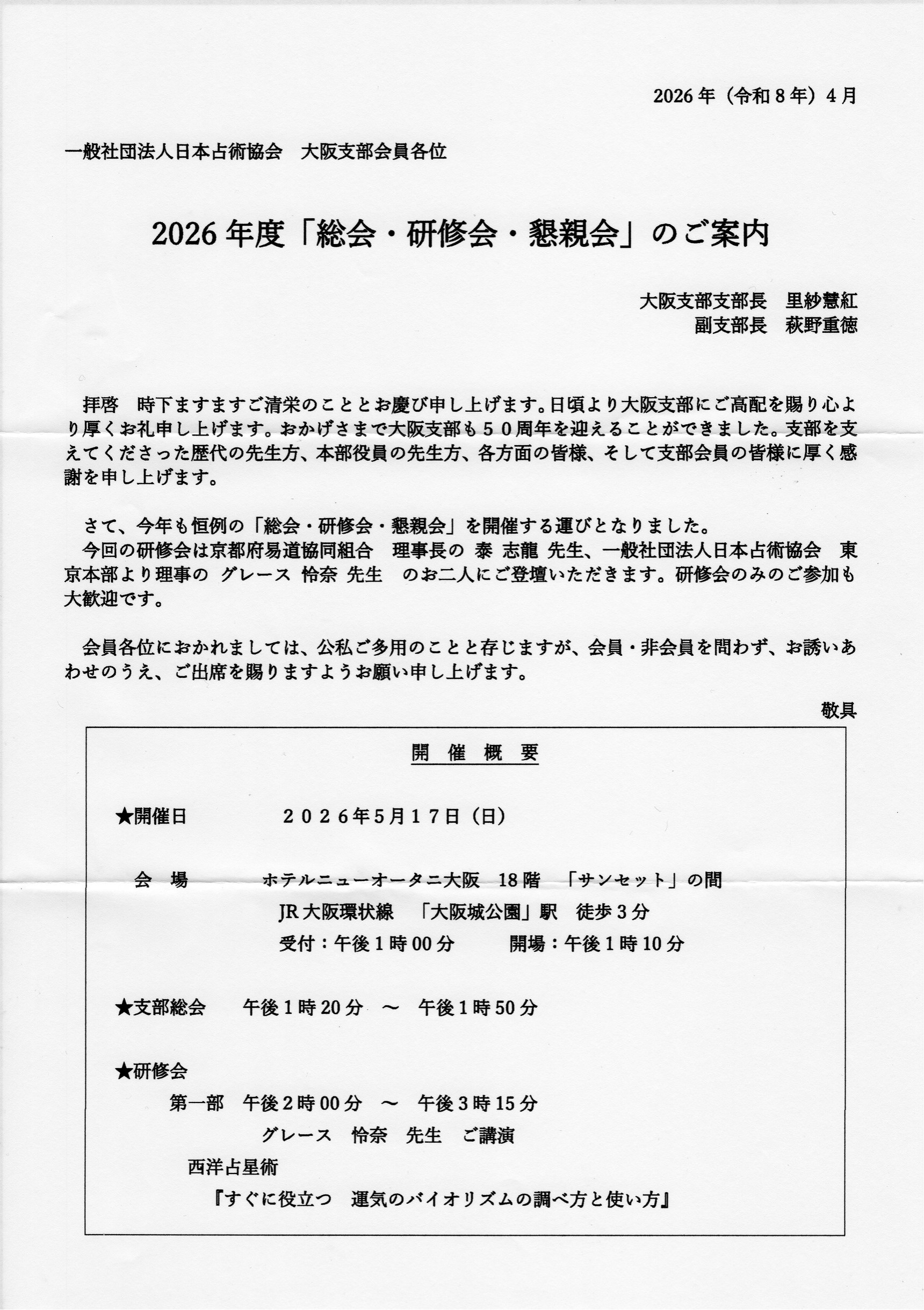 一般社団法人 日本占術協会 大阪支部様の総会イベントにて理事長 泰 志龍が講演をさせて頂くことになりました。御興味を持って頂ける方は5月5日までに、私までご一報下さいませ!直接お申し込みをされる場合は「泰 志龍の紹介」と、また京都府易道協同組合の組合員の方は、その旨をお伝え下さい。